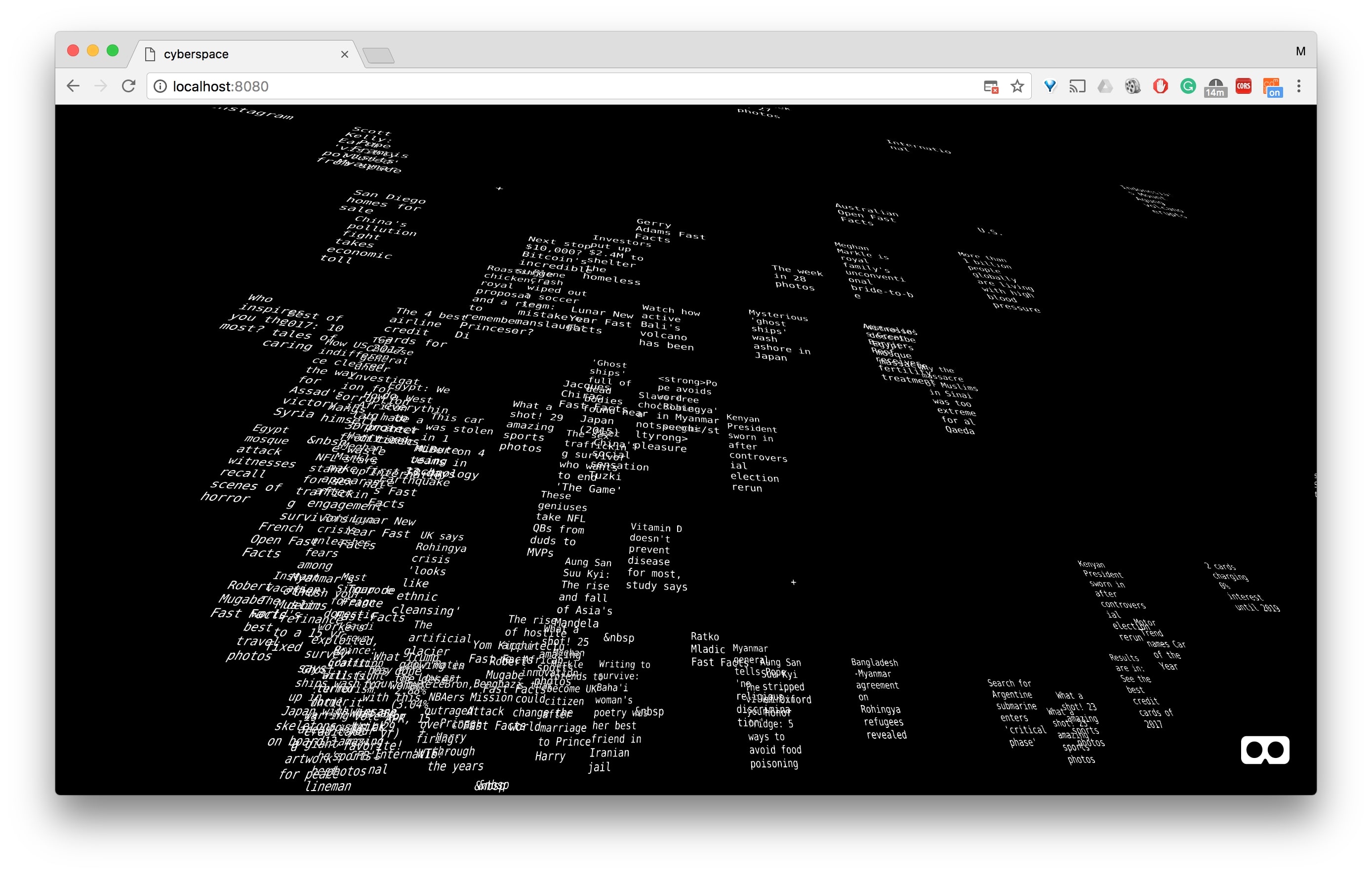A Virtual Reality experience that aims to flatten the hierarchy of the web and allow users to navigate content in space. Headlines, captions and footnotes are given equal importance.